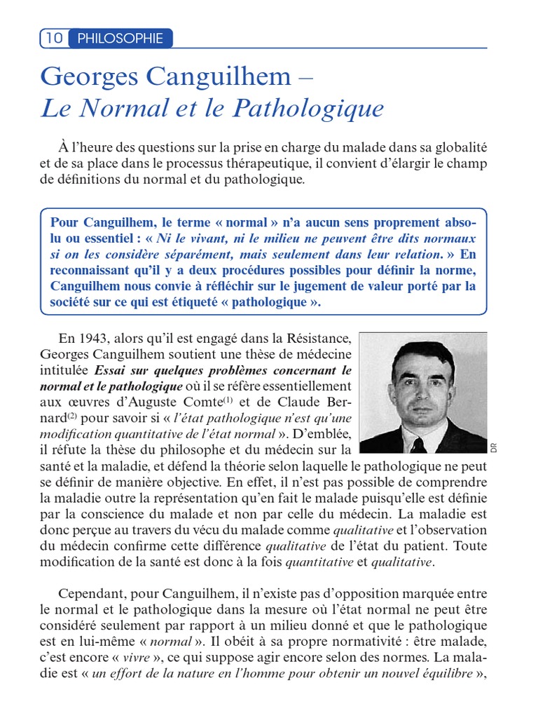 Le normal et le pathologique rsum. Il y aborde le thme de la maladie en se demandant quelle est la nature de ce quon nomme maladie. Nanmoins ce mouvement ne permet pas de traiter les pathologies des plus lourdes. Ses thories ont donc marques toute une gnration de philosophes contemporains et son livre Le Normal et le Pathologique reste une rfrence concernant la philosophie de la mdecine.