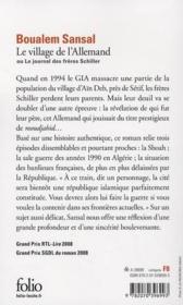 Le village de lAllemand ou Le journal des frres Schiller Premire parution en 2008 Collection Folio n 4950 Gallimard Parution. Le Village de lAllemand sous-titr Le Journal des frres Schiller est un roman de Boualem Sansal paru le 3 janvier 2008 aux ditions Gallimard et ayant reu la mme anne le grand prix RTL-Lire 1 le grand prix du roman de la SGDL le prix Louis-Guilloux et le prix Nessim-Habif 2. Ils ont t levs par un vieil oncle immigr dans une cit de la banlieue parisienne tandis que leurs parents restaient dans leur village dAn Deb prs de Stif.