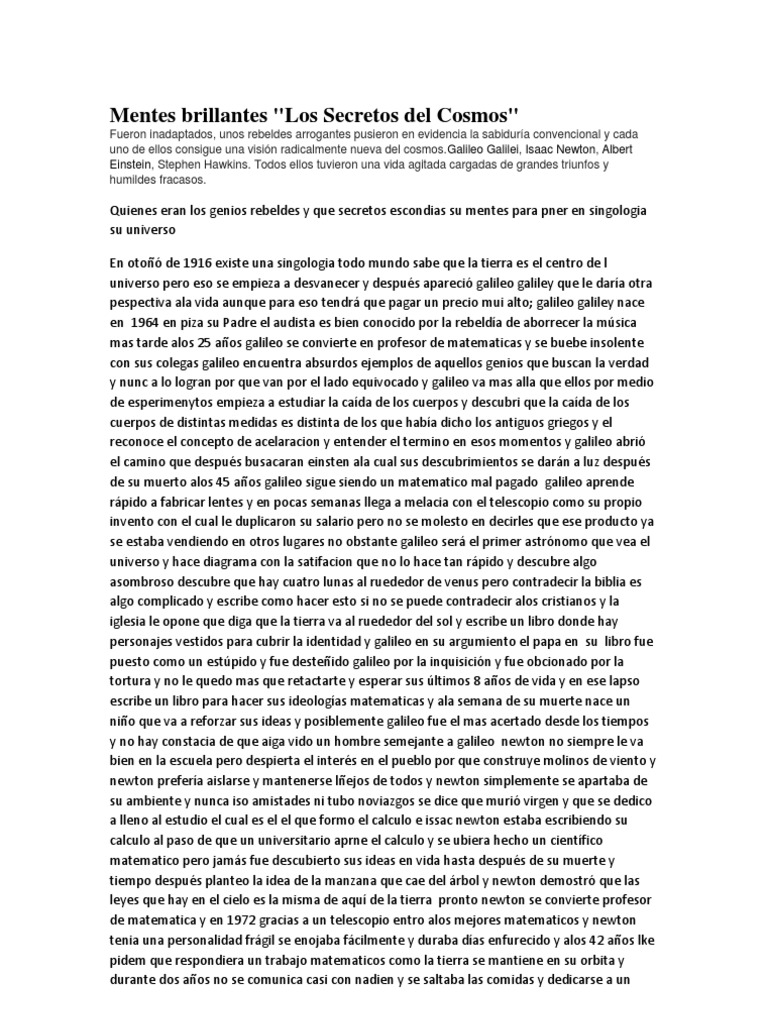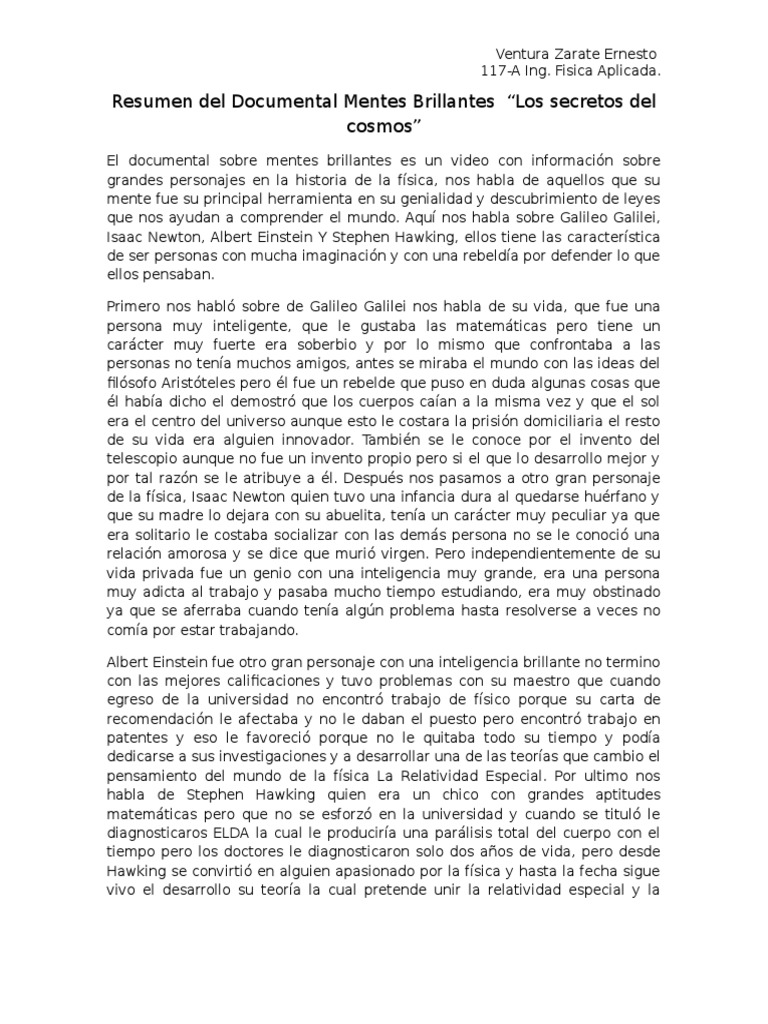 Mentes brillantes los secretos del cosmosGalileo GalileiIsaac NewtonAlbert EinsteinStephen William Hawking. Resumen Del Documental Mentes Brillantes. Encuentra una respuesta a tu pregunta nesesito un resumen largo y bien redactado de Documental Completo.