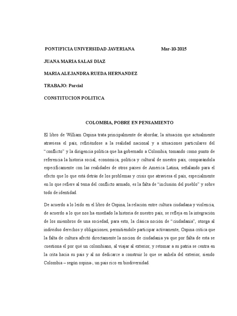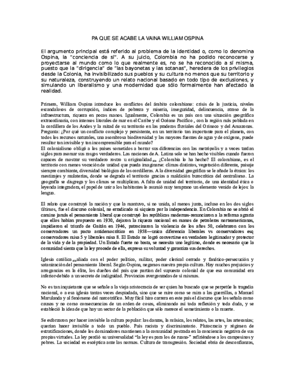 Hacer clic para expandir la informacin del documento. Resumen del libro Pa Que Se Acabe la Vaina William Ospina odos los males que han aquejado a este pas son. Amrica Latina solo se han hecho visibles para el mundo y menciono remedo porque en Colombia nunca se abri camino para el pensamiento liberal que construyo las republicas.
