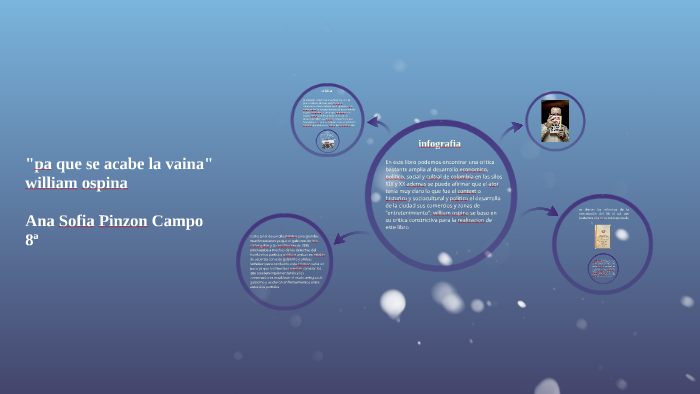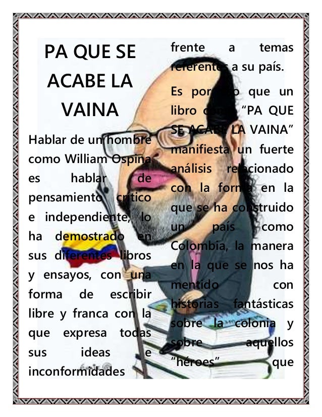 Hay una paradoja en Pa que se acabe la vaina que juzgo especialmente notable. Pa que se acabe la vaina Ms que todo lo que he podido entender es que bueno en un pas que quieren hablar de libertad si el mismo pas las personas de odian y crean una sensacin de odio a su alrededor rechazo a los indgenas desprecio y racismo a las personas de color que aunque les duela a muchos somos descendientes de ellos de igual forma. Martes 22 de abril de 2014 PA QUE SE ACABE LA VAINA - WILLIAM OSPINA RESEA El ltimo libro de William Ospina Pa que se acabe la vaina publicado en noviembre del ao pasado busca crear conciencia en los colombianos acerca del pas en que vivimos.