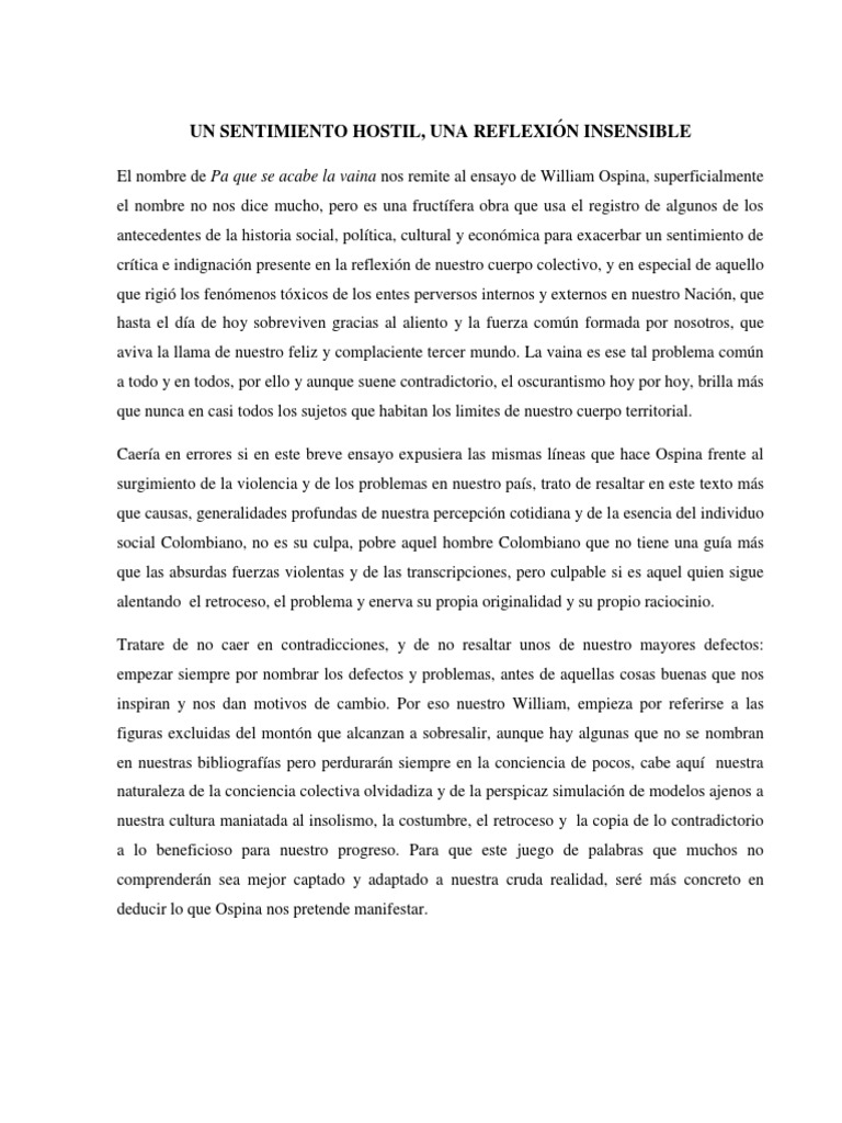 PA QUE SE ACABE LA VAINA DE WILLIAM OSPINA Consecuencias Personajes polticos El atraso en la modernizacin de los centros urbanos la desilusin por parte de los gobernantes en cuanto al territorio que les correspondi gobernar y que esto sea una de las posibles causas de la. Pa que se acabe la vaina es un ensayo del escritor colombiano William Ospina en el cual este autor pregunta por la realidad colombiana reanudando los interrogantes que ha planteado anteriormente en algunas de sus obras. 100 2 100 encontr este documento til 2 votos 677 vistas 2 pginas.