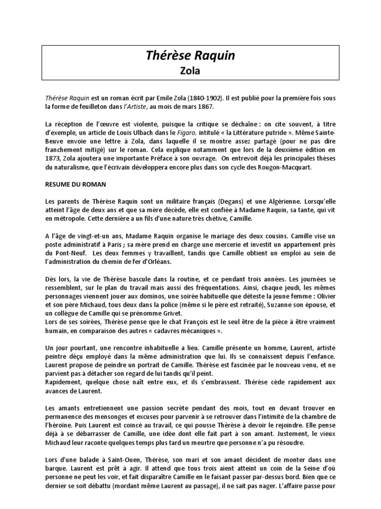 Thrse raquin rsum. Cette reuvre a ete jugee comme ecreurante et cest la raison pour laquelle Zola la defend dans la preface de sa seconde edition. Alors quelle nest ge que de seulement deux ans Thrse perd sa mre. Thrse Raquin est la fille dune femme africaine et dun capitaine franais Degans qui tait en Algrie.